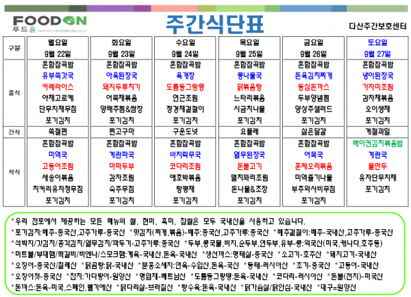 <<< 9월4주차 주간 식단표 >>> 페이지 정보 작성자 명품다산주야간보호센터 작성일25-09-22 07:33 조회75회 댓글0건 관련링크 이전글 다음글 목록 본문 9월4주차 주간 식단표 입니다. 이전글 다음글 목록