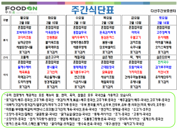 <<< 2월2주차 주간 식단표 >>> 페이지 정보 작성자 명품다산주야간보호센터 작성일26-02-09 09:35 조회400회 댓글0건 관련링크 이전글 다음글 목록 본문 2월2주차 주간 식단표 입니다. 이전글 다음글 목록