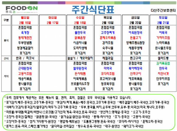 <<< 2월3주차 주간 식단표 >>> 페이지 정보 작성자 명품다산주야간보호센터 작성일26-02-15 12:54 조회70회 댓글0건 관련링크 이전글 다음글 목록 본문 2월3주차 주간 식단표 입니다. 이전글 다음글 목록
