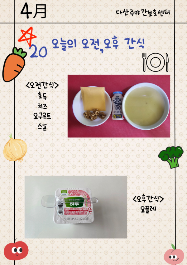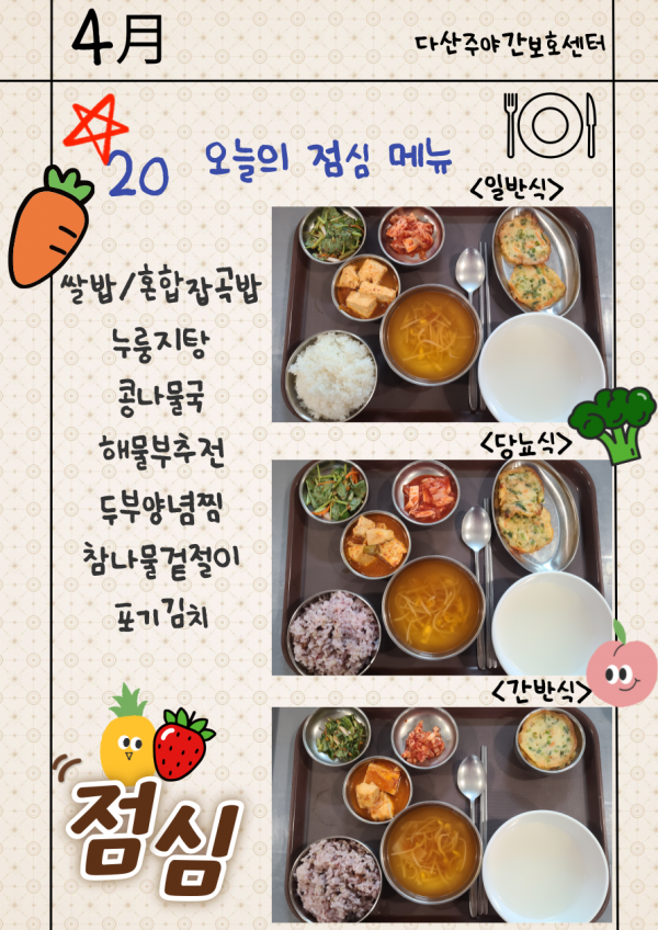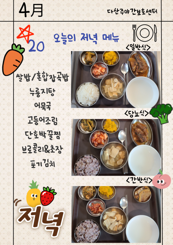4월20일 (월요일) 오늘의 식단 페이지 정보 작성자 명품다산주야간보호센터 작성일26-04-20 16:03 조회14회 댓글0건 관련링크 이전글 다음글 목록 본문 오늘의 식단 입니다. 이전글 다음글 목록