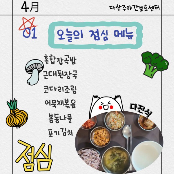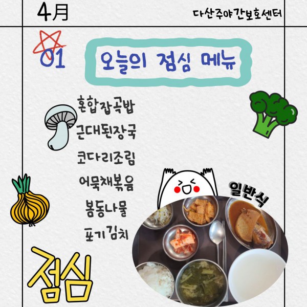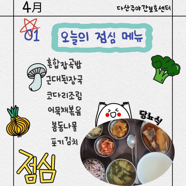 4월1일 (수요일) 점심식단 페이지 정보 작성자 명품다산주야간보호센터 작성일26-04-01 11:49 조회28회 댓글0건 관련링크 이전글 다음글 목록 본문 점심식단 입니다.(일반식,당뇨식,간반식) 이전글 다음글 목록