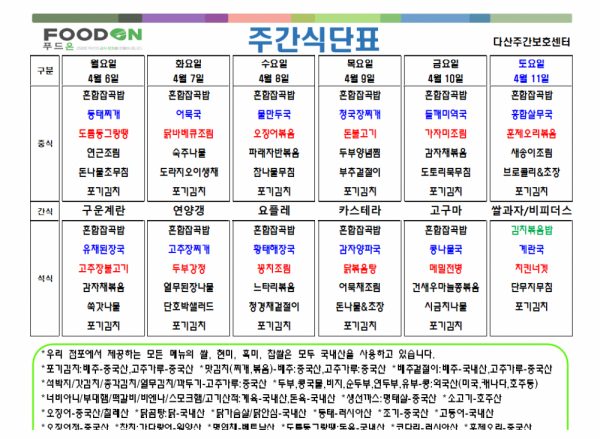 <<< 4월2주차 주간 식단표 >>> 페이지 정보 작성자 명품다산주야간보호센터 작성일26-04-06 08:54 조회33회 댓글0건 관련링크 이전글 다음글 목록 본문 4월2주차 주간 식단표입니다. 이전글 다음글 목록