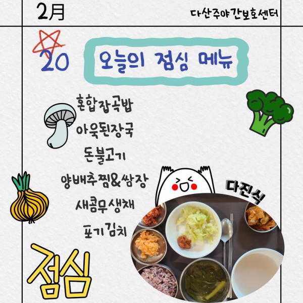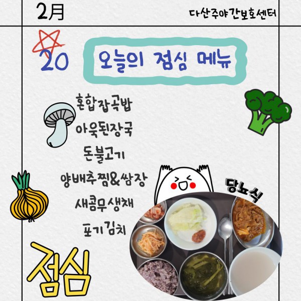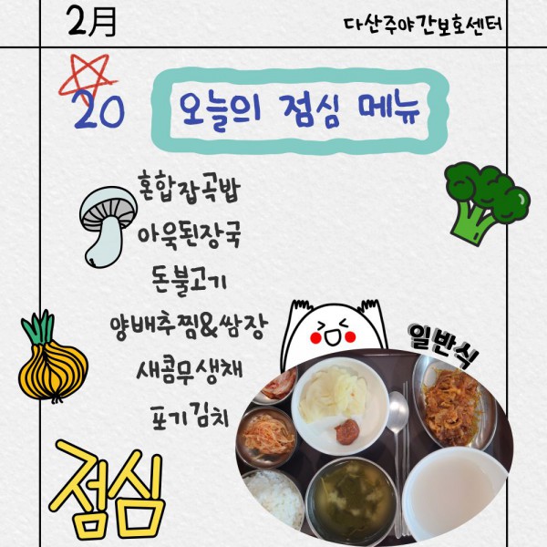 2월20일 점심식단 페이지 정보 작성자 명품다산주야간보호센터 작성일26-02-20 11:56 조회645회 댓글0건 관련링크 이전글 다음글 목록 본문 점심식단 입니다.(일반식,당뇨식,간반식) 이전글 다음글 목록