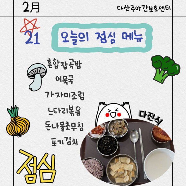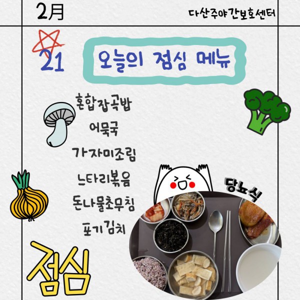 2월21일 점심식단 페이지 정보 작성자 명품다산주야간보호센터 작성일26-02-21 13:40 조회652회 댓글0건 관련링크 이전글 다음글 목록 본문 점심식단 입니다.(일반식,당뇨식,간반식) 이전글 다음글 목록