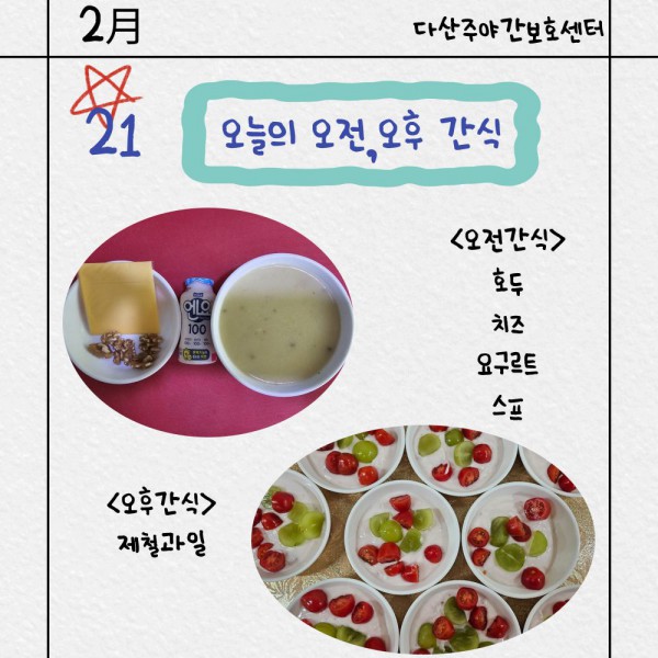 2월21일 오전/오후간식 페이지 정보 작성자 명품다산주야간보호센터 작성일26-02-21 17:07 조회648회 댓글0건 관련링크 이전글 다음글 목록 본문 오전/오후간식 입니다. 이전글 다음글 목록