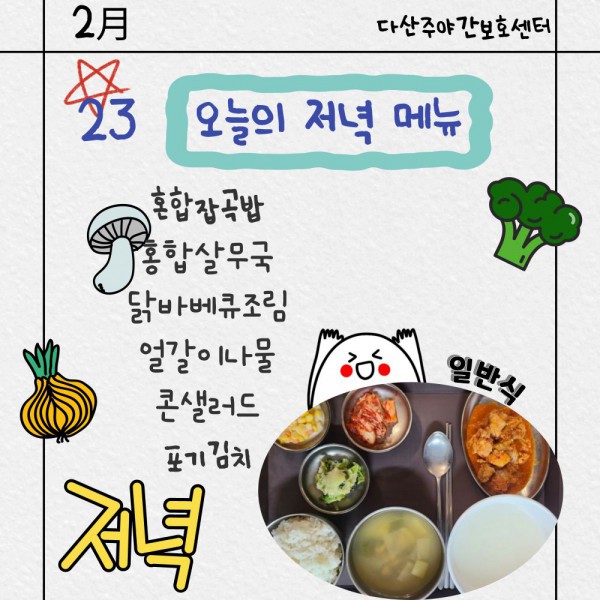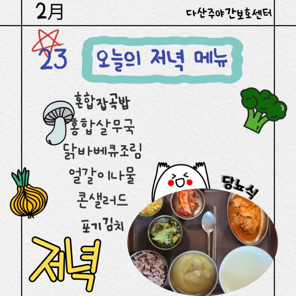 2월23일 저녁식단 페이지 정보 작성자 명품다산주야간보호센터 작성일26-02-23 16:08 조회658회 댓글0건 관련링크 이전글 다음글 목록 본문 저녁식단 입니다.(일반식,당뇨식,간반식) 이전글 다음글 목록
