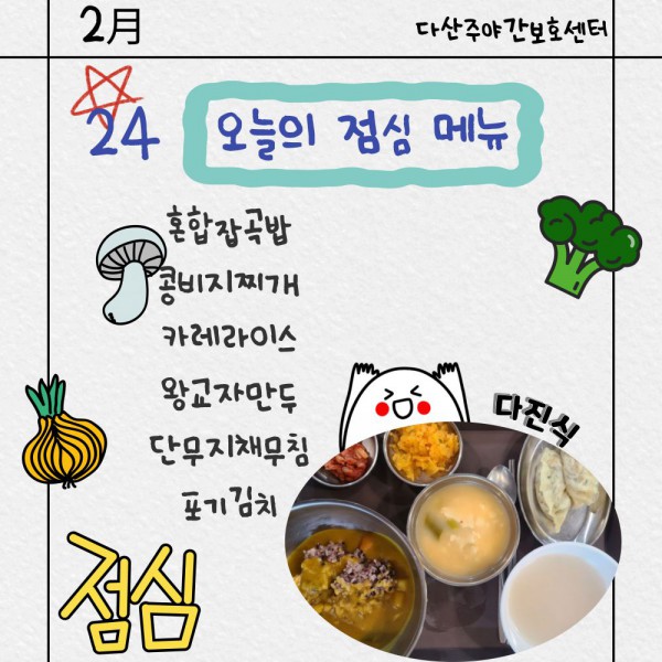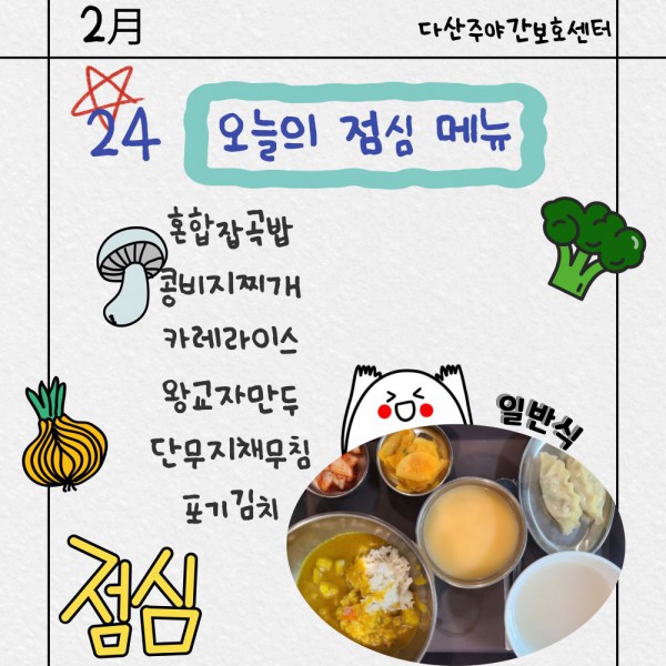 2월24일 점심식단 페이지 정보 작성자 명품다산주야간보호센터 작성일26-02-24 11:34 조회662회 댓글0건 관련링크 이전글 다음글 목록 본문 점심식단 입니다.(일반식,당뇨식,간반식) 이전글 다음글 목록