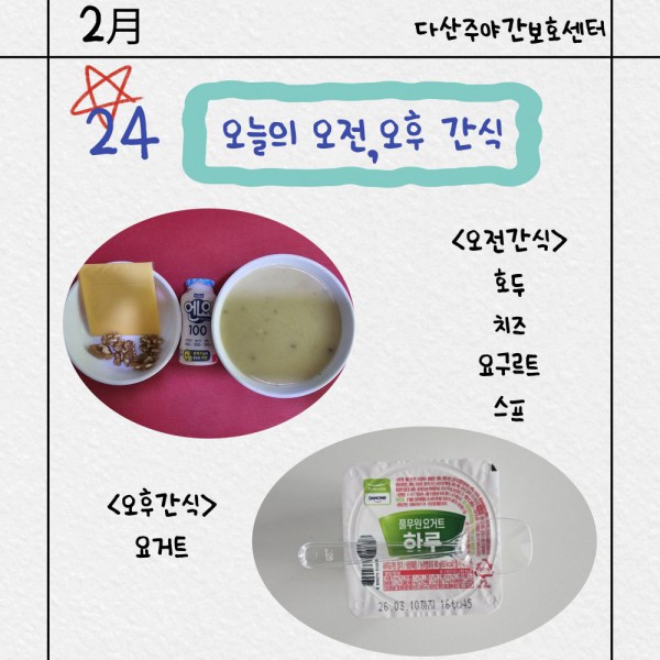 2월24일 오전/오후간식 페이지 정보 작성자 명품다산주야간보호센터 작성일26-02-24 15:12 조회654회 댓글0건 관련링크 이전글 다음글 목록 본문 오전/오후간식 입니다. 이전글 다음글 목록