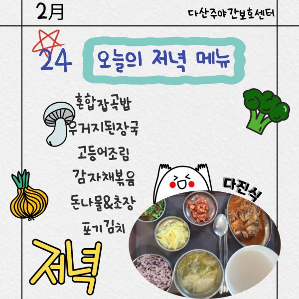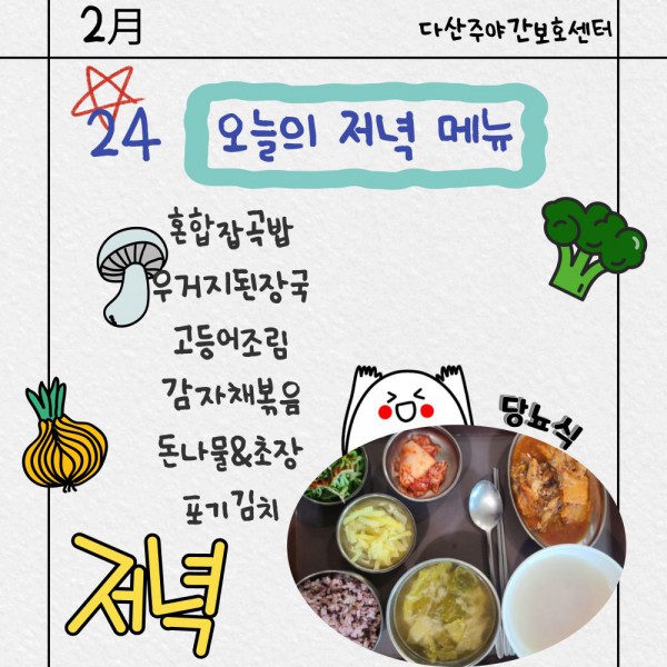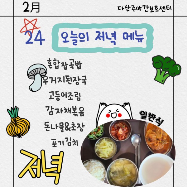 2월24일 저녁식단 페이지 정보 작성자 명품다산주야간보호센터 작성일26-02-24 16:06 조회659회 댓글0건 관련링크 이전글 다음글 목록 본문 저녁식단 입니다.(일반식,당뇨식,간반식) 이전글 다음글 목록