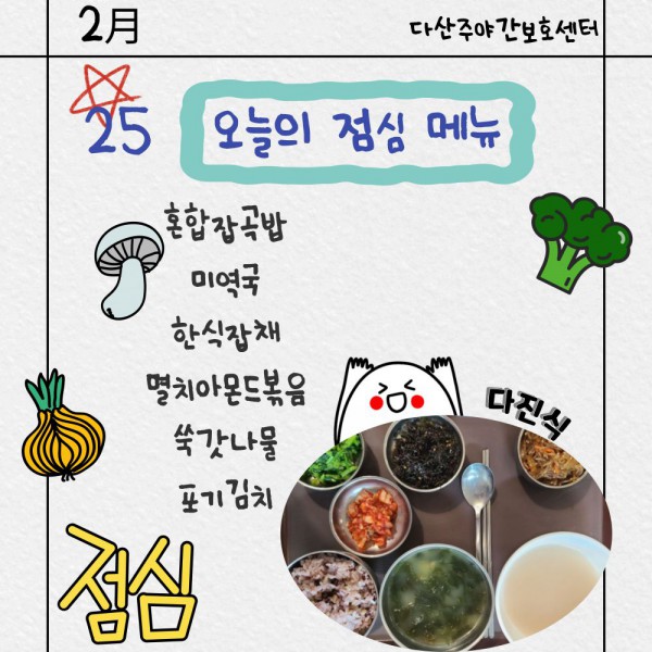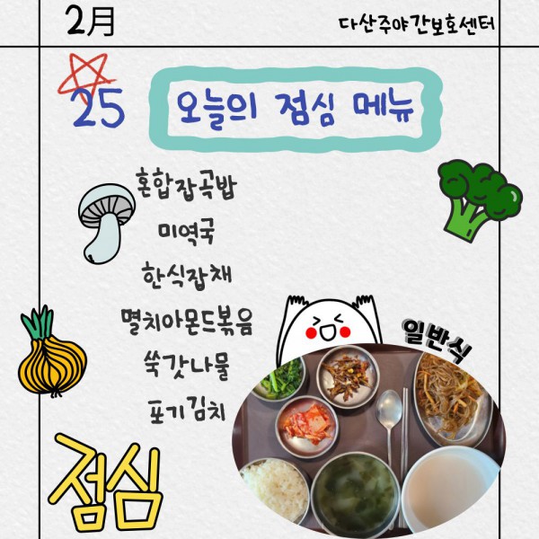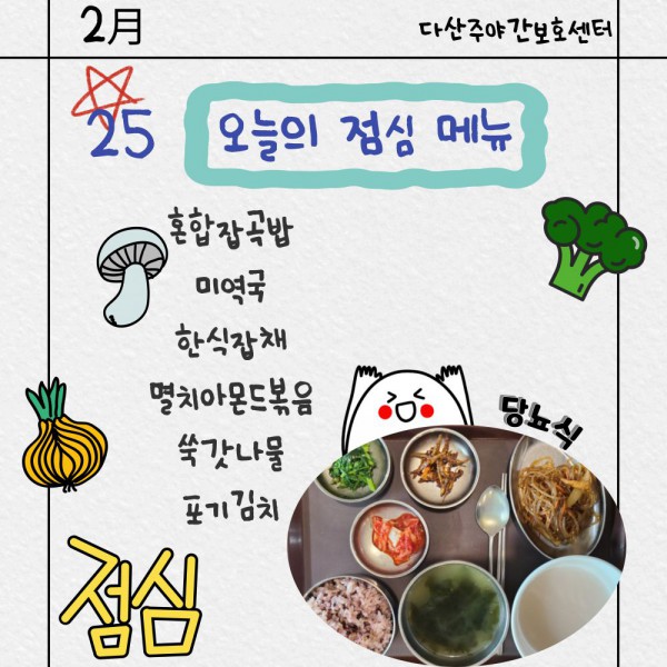 2월25일 점심식단 페이지 정보 작성자 명품다산주야간보호센터 작성일26-02-25 15:42 조회649회 댓글0건 관련링크 이전글 다음글 목록 본문 점심식단 입니다.(일반식,당뇨식,간반식) 이전글 다음글 목록