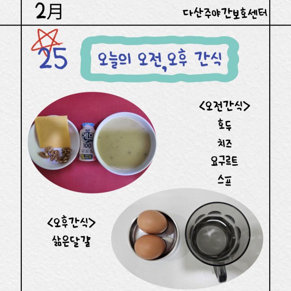 2월25일 오전/오후간식 페이지 정보 작성자 명품다산주야간보호센터 작성일26-02-25 15:43 조회646회 댓글0건 관련링크 이전글 다음글 목록 본문 오전/오후간식 입니다. 이전글 다음글 목록