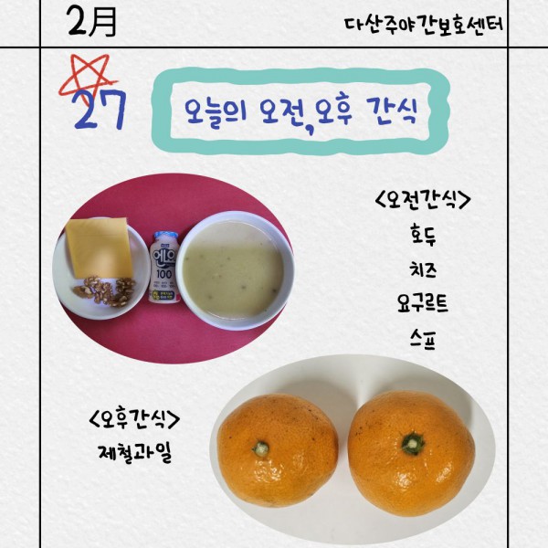 2월27일 오전/오후간식 페이지 정보 작성자 명품다산주야간보호센터 작성일26-02-27 15:39 조회634회 댓글0건 관련링크 이전글 다음글 목록 본문 오전/오후간식 입니다. 이전글 다음글 목록