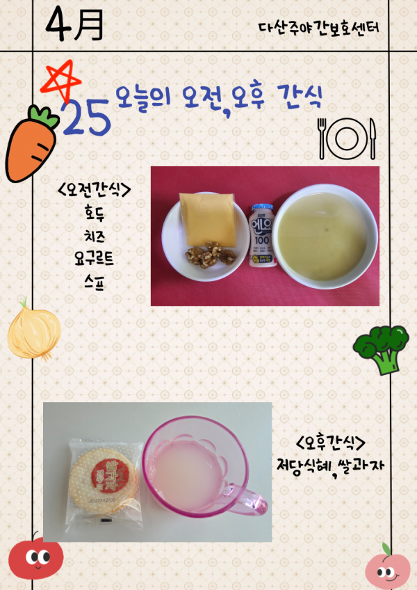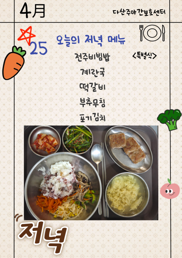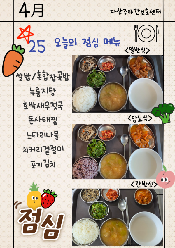 4월25일 (토요일) 오늘의 식단 페이지 정보 작성자 명품다산주야간보호센터 작성일26-04-25 16:22 조회5회 댓글0건 관련링크 다음글 목록 본문 오늘의 식단 입니다. 다음글 목록