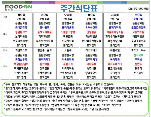<<< 2월1주차 주간 식단표 >>> 페이지 정보 작성자 명품다산주야간보호센터 작성일25-02-03 09:40 조회2,713회 댓글0건 관련링크 이전글 다음글 목록 본문 2월1주차 주간 식단표 입니다. 이전글 다음글 목록