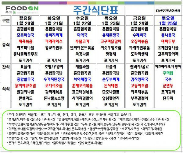 <<< 1월4주차 주간 식단표 >>> 페이지 정보 작성자 명품다산주야간보호센터 작성일25-01-20 11:16 조회2,567회 댓글0건 관련링크 이전글 다음글 목록 본문 1월4주차 주간 식단표 입니다. 이전글 다음글 목록