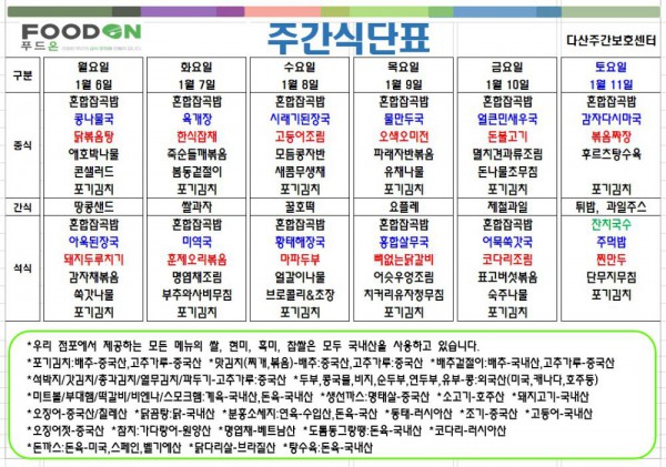 <<< 1월2주차 주간 식단표 >>> 페이지 정보 작성자 명품다산주야간보호센터 작성일25-01-06 07:49 조회2,822회 댓글0건 관련링크 이전글 다음글 목록 본문 1월2주차 주간 식단표 입니다. 이전글 다음글 목록