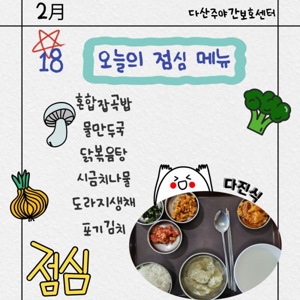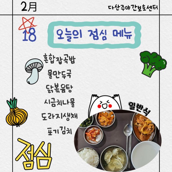 2월18일 점심식단 페이지 정보 작성자 명품다산주야간보호센터 작성일26-02-18 16:24 조회660회 댓글0건 관련링크 이전글 다음글 목록 본문 점심식단 입니다.(일반식,당뇨식,간반식) 이전글 다음글 목록