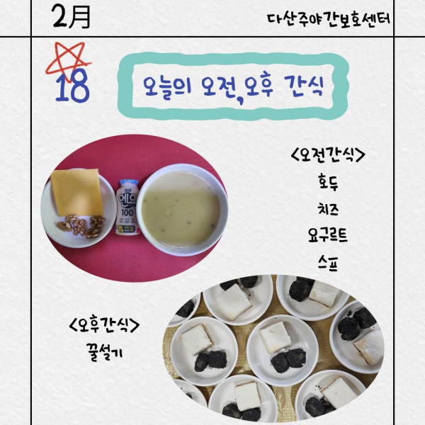 2월18일 오전/오후간식 페이지 정보 작성자 명품다산주야간보호센터 작성일26-02-18 16:24 조회658회 댓글0건 관련링크 이전글 다음글 목록 본문 오전/오후간식 입니다. 이전글 다음글 목록