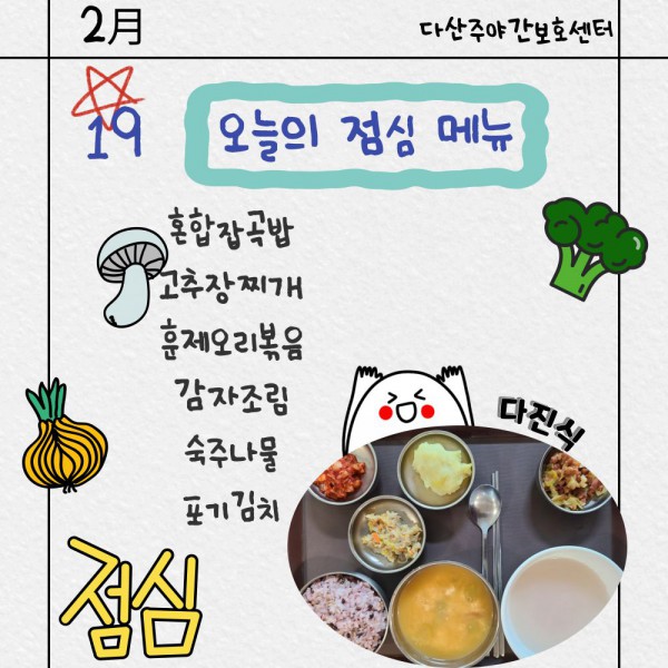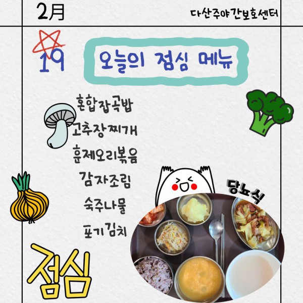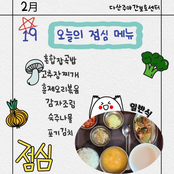 2월19일 점심식단 페이지 정보 작성자 명품다산주야간보호센터 작성일26-02-19 11:13 조회654회 댓글0건 관련링크 이전글 다음글 목록 본문 점심식단 입니다.(일반식,당뇨식,간반식) 이전글 다음글 목록