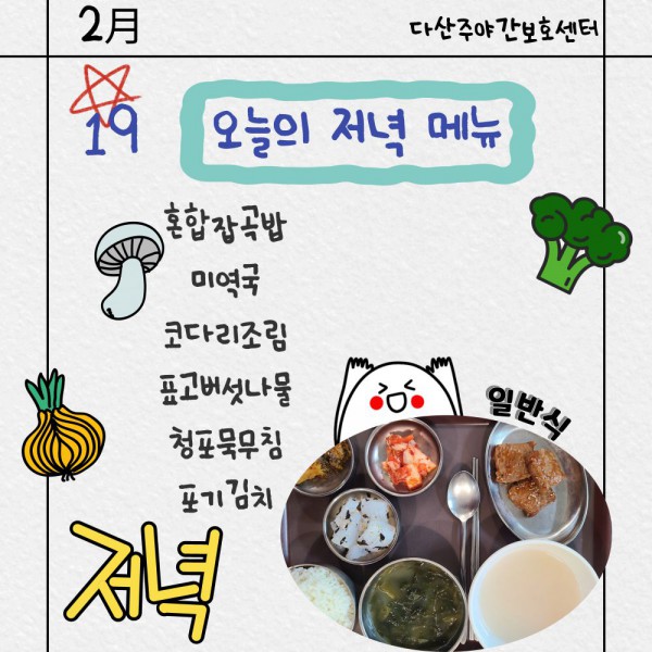 2월19일 저녁식단 페이지 정보 작성자 명품다산주야간보호센터 작성일26-02-19 16:05 조회643회 댓글0건 관련링크 이전글 다음글 목록 본문 저녁식단 입니다.(일반식,당뇨식,간반식) 이전글 다음글 목록