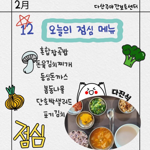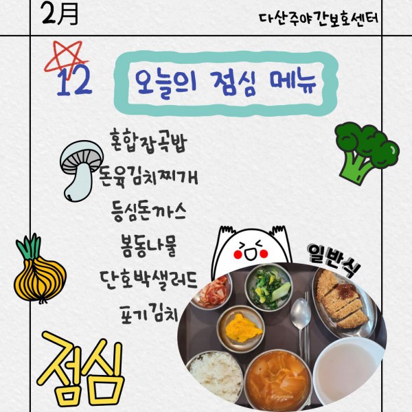 2월12일 점심식단 페이지 정보 작성자 명품다산주야간보호센터 작성일26-02-12 11:19 조회869회 댓글0건 관련링크 이전글 다음글 목록 본문 점심식단 입니다.(일반식,당뇨식,간반식) 이전글 다음글 목록