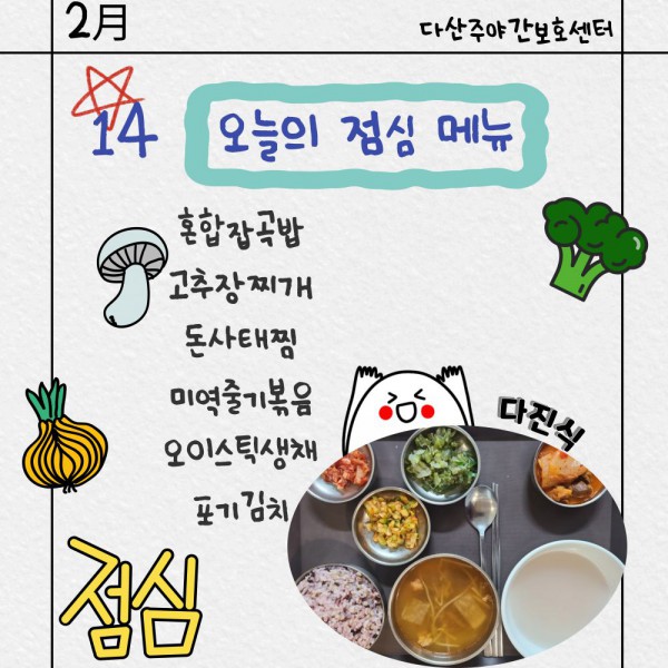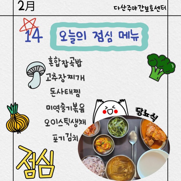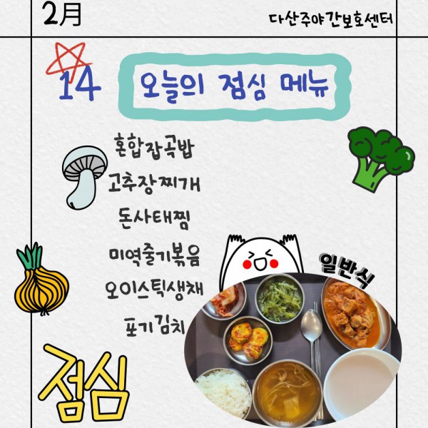 2월14일 점심식단 페이지 정보 작성자 명품다산주야간보호센터 작성일26-02-14 11:32 조회694회 댓글0건 관련링크 이전글 다음글 목록 본문 점심식단 입니다.(일반식,당뇨식,간반식) 이전글 다음글 목록