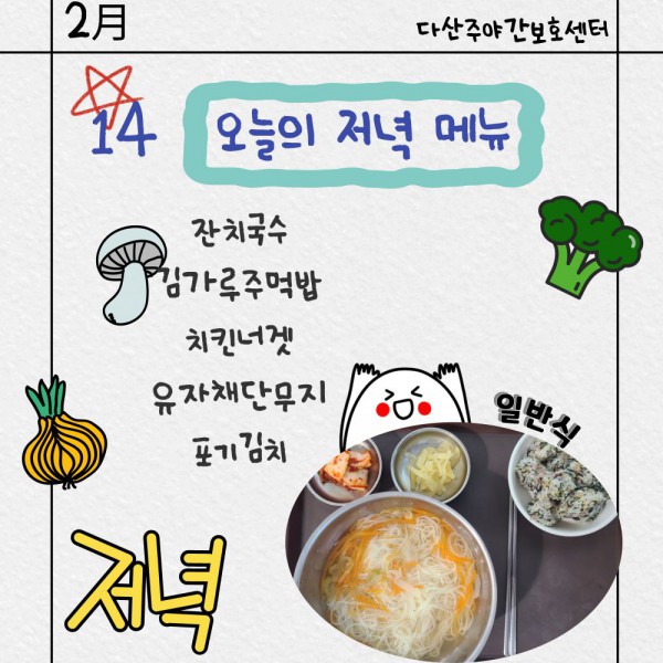 2월14일 저녁식단 페이지 정보 작성자 명품다산주야간보호센터 작성일26-02-14 16:05 조회676회 댓글0건 관련링크 이전글 다음글 목록 본문 저녁식단 입니다. 이전글 다음글 목록
