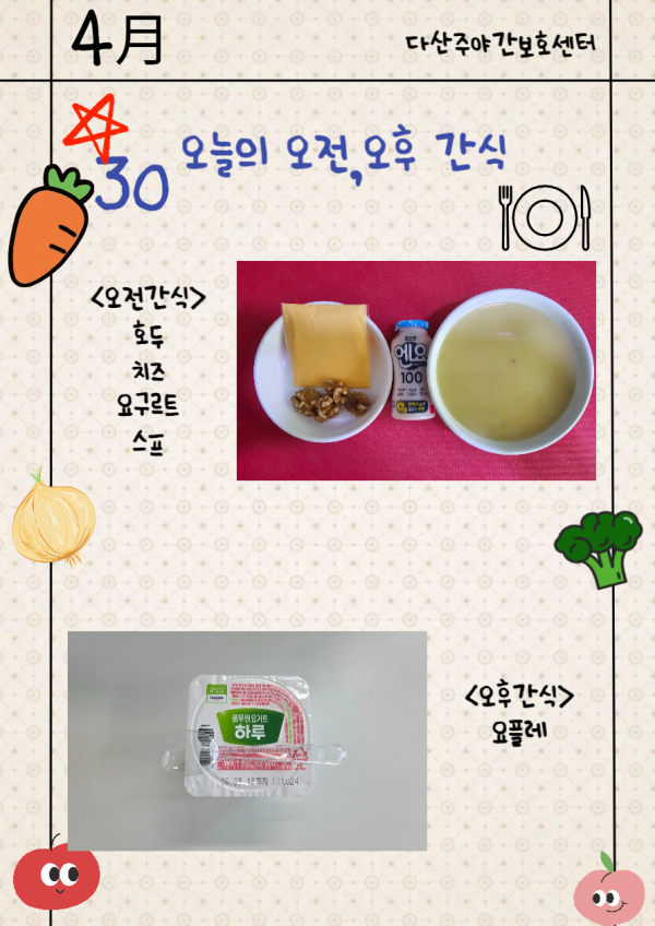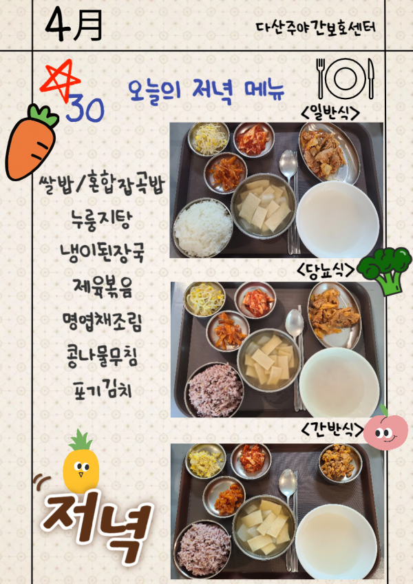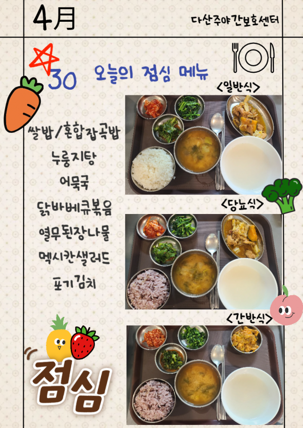 4월30일 (목요일) 오늘의 식단 페이지 정보 작성자 명품다산주야간보호센터 작성일26-04-30 16:08 조회7회 댓글0건 관련링크 다음글 목록 본문 오늘의 식단 입니다. 다음글 목록