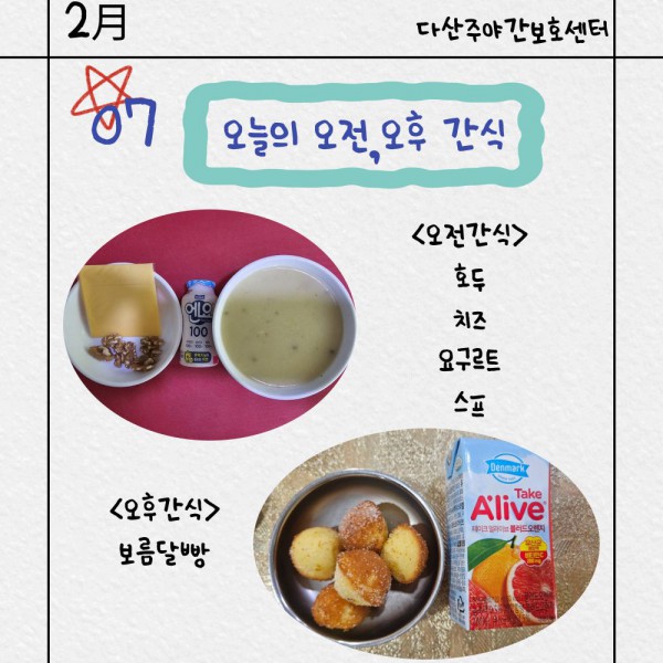 2월7일 오전/오후간식 페이지 정보 작성자 명품다산주야간보호센터 작성일26-02-07 14:35 조회963회 댓글0건 관련링크 이전글 다음글 목록 본문 오전/오후간식 입니다. 이전글 다음글 목록