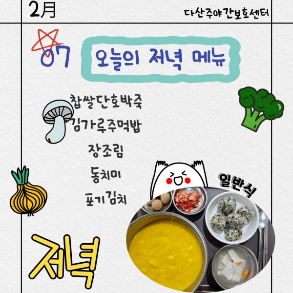2월7일 저녁식단 페이지 정보 작성자 명품다산주야간보호센터 작성일26-02-07 16:24 조회962회 댓글0건 관련링크 이전글 다음글 목록 본문 저녁식단 입니다. 이전글 다음글 목록