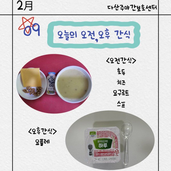 2월9일 오전/오후간식 페이지 정보 작성자 명품다산주야간보호센터 작성일26-02-09 15:23 조회968회 댓글0건 관련링크 이전글 다음글 목록 본문 오전/오후간식 입니다. 이전글 다음글 목록