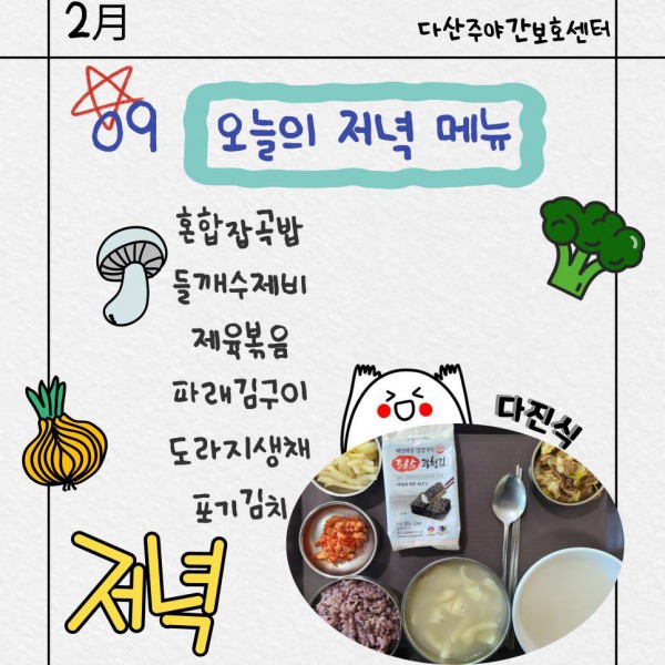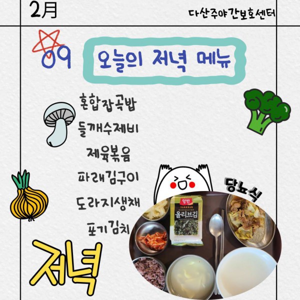 2월9일 저녁식단 페이지 정보 작성자 명품다산주야간보호센터 작성일26-02-09 16:05 조회972회 댓글0건 관련링크 이전글 다음글 목록 본문 저녁식단 입니다. 이전글 다음글 목록