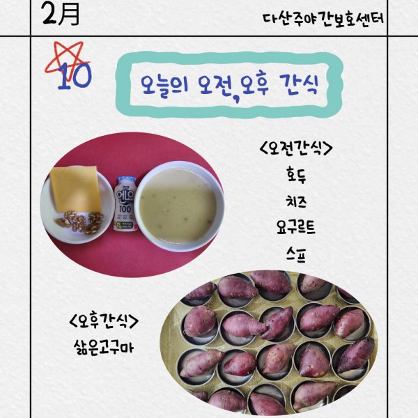 2월10일 오전/오후간식 페이지 정보 작성자 명품다산주야간보호센터 작성일26-02-10 15:22 조회971회 댓글0건 관련링크 이전글 다음글 목록 본문 오전/오후간식 입니다. 이전글 다음글 목록