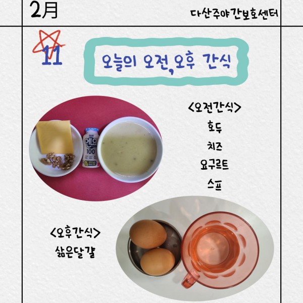 2월11일 오전/오후간식 페이지 정보 작성자 명품다산주야간보호센터 작성일26-02-11 15:10 조회939회 댓글0건 관련링크 이전글 다음글 목록 본문 오전/오후간식 입니다. 이전글 다음글 목록