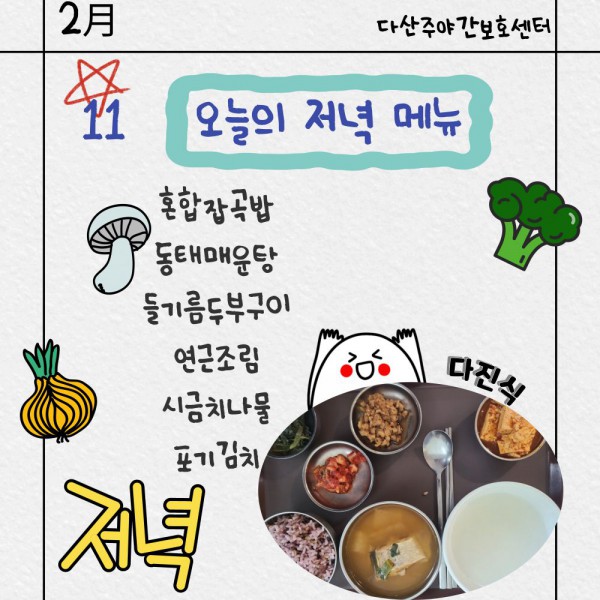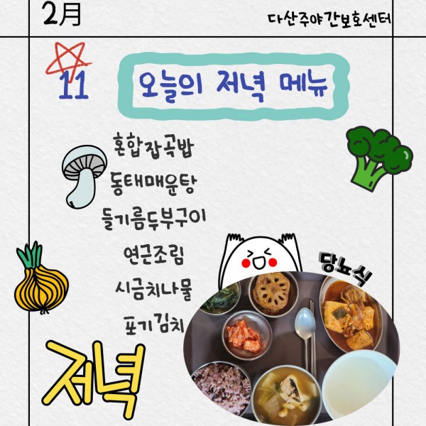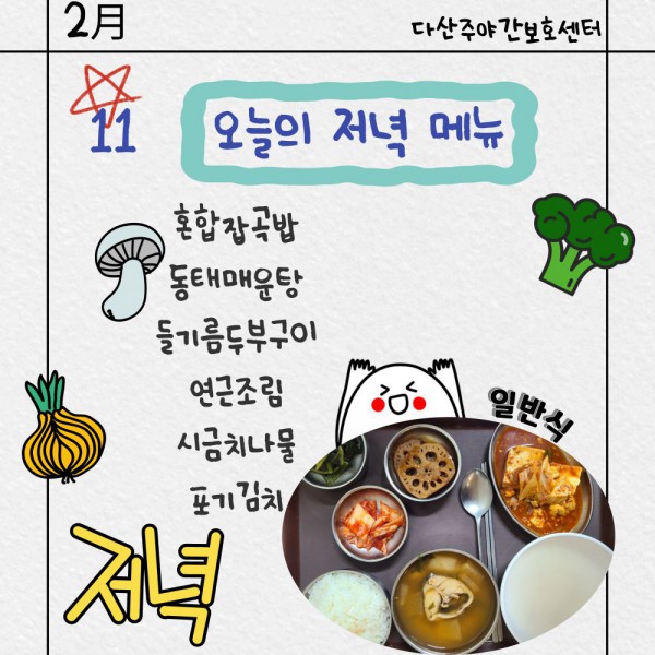 2월11일 저녁식단 페이지 정보 작성자 명품다산주야간보호센터 작성일26-02-11 16:08 조회940회 댓글0건 관련링크 이전글 다음글 목록 본문 저녁식단 입니다.(일반식,당뇨식,간반식) 이전글 다음글 목록