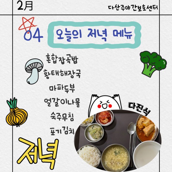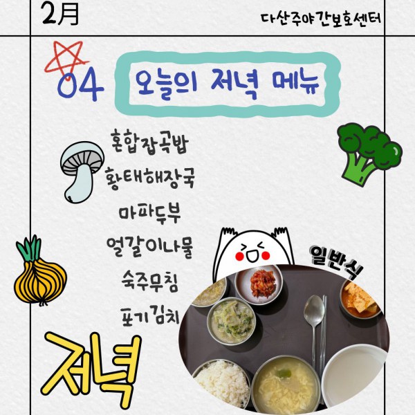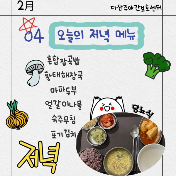 2월4일 저녁식단 페이지 정보 작성자 명품다산주야간보호센터 작성일26-02-04 16:15 조회959회 댓글0건 관련링크 이전글 다음글 목록 본문 저녁식단 입니다.(일반식,당뇨식,간반식) 이전글 다음글 목록