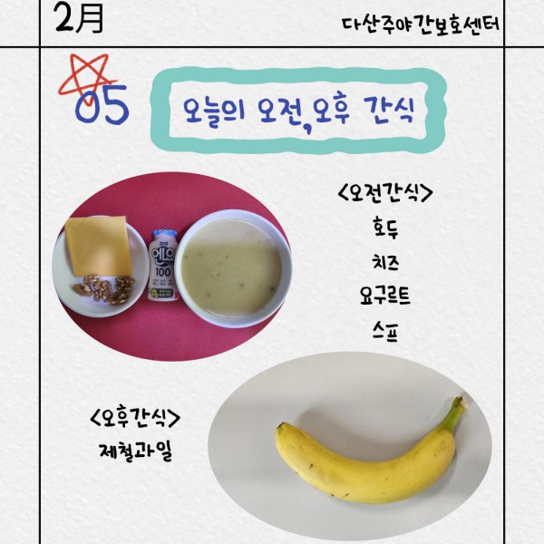 2월5일 오전/오후간식 페이지 정보 작성자 명품다산주야간보호센터 작성일26-02-05 15:19 조회986회 댓글0건 관련링크 이전글 다음글 목록 본문 오전/오후간식 입니다. 이전글 다음글 목록