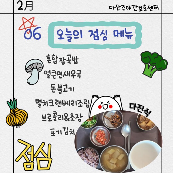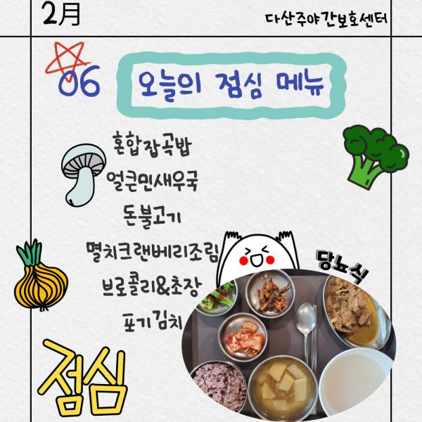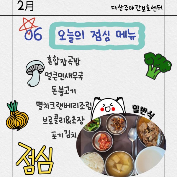 2월6일 점심식단 페이지 정보 작성자 명품다산주야간보호센터 작성일26-02-06 11:19 조회974회 댓글0건 관련링크 이전글 다음글 목록 본문 점심식단 입니다.(일반식,당뇨식,간반식) 이전글 다음글 목록