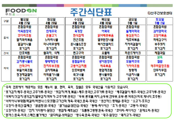 <<< 4월5주차 주간 식단표 >>> 페이지 정보 작성자 명품다산주야간보호센터 작성일26-04-27 08:48 조회138회 댓글0건 관련링크 이전글 다음글 목록 본문 4월5주차 주간 식단표 입니다. 이전글 다음글 목록