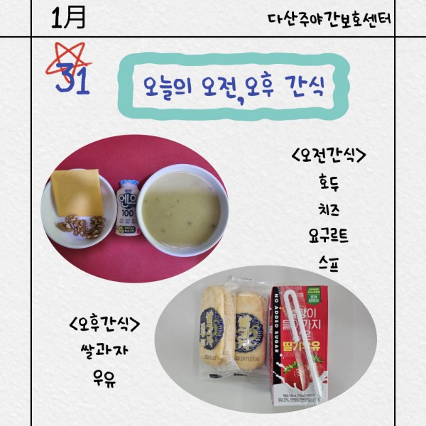 1월31일 오전/오후간식 페이지 정보 작성자 명품다산주야간보호센터 작성일26-01-31 19:15 조회967회 댓글0건 관련링크 이전글 다음글 목록 본문 오전/오후간식 입니다. 이전글 다음글 목록