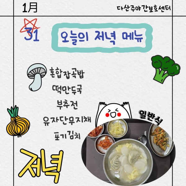 1월31일 저녁식단 페이지 정보 작성자 명품다산주야간보호센터 작성일26-01-31 19:15 조회967회 댓글0건 관련링크 이전글 다음글 목록 본문 저녁식단 입니다. 이전글 다음글 목록