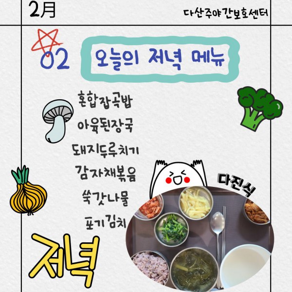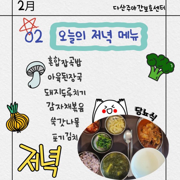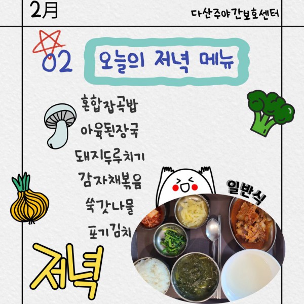 2월2일 저녁식단 페이지 정보 작성자 명품다산주야간보호센터 작성일26-02-02 16:07 조회977회 댓글0건 관련링크 이전글 다음글 목록 본문 저녁식단 입니다.(일반식,당뇨식,간반식) 이전글 다음글 목록