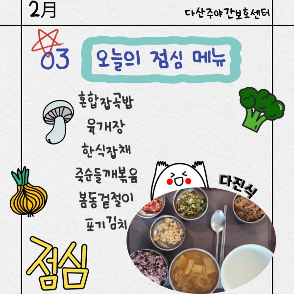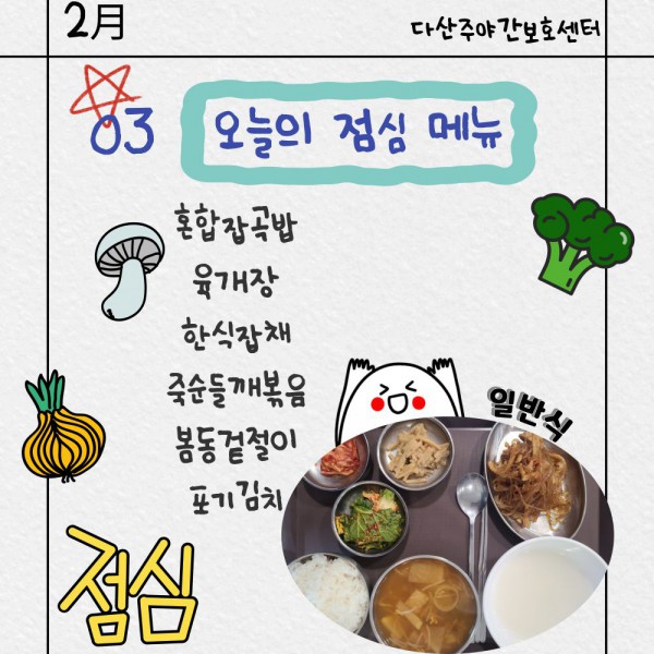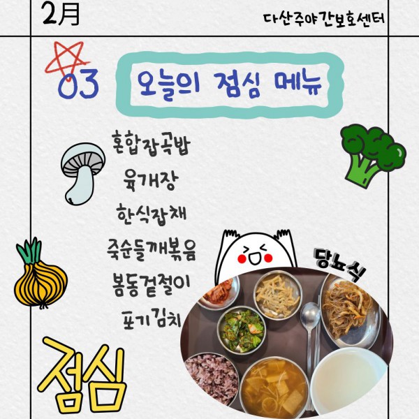 2월3일 점심식단 페이지 정보 작성자 명품다산주야간보호센터 작성일26-02-03 11:17 조회977회 댓글0건 관련링크 이전글 다음글 목록 본문 점심식단 입니다.(일반식,당뇨식,간반식) 이전글 다음글 목록