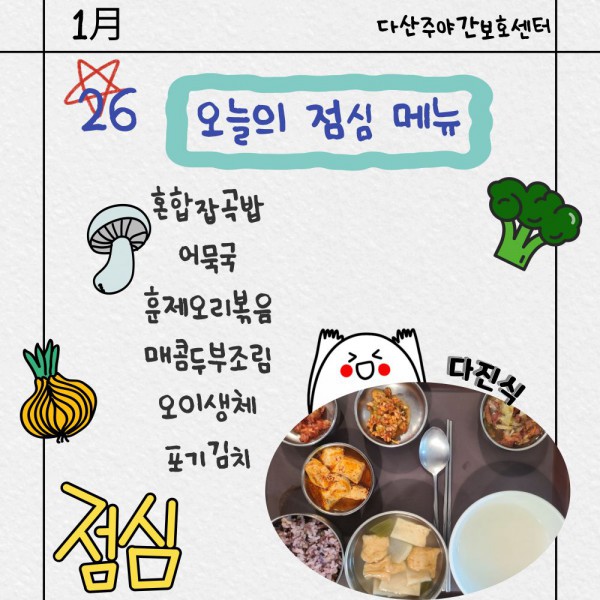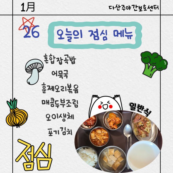 1월26일 점심식단 페이지 정보 작성자 명품다산주야간보호센터 작성일26-01-26 11:46 조회998회 댓글0건 관련링크 이전글 다음글 목록 본문 점심식단 입니다.(일반식.당뇨식,간반식) 이전글 다음글 목록