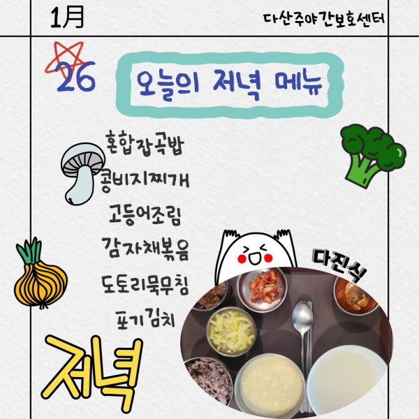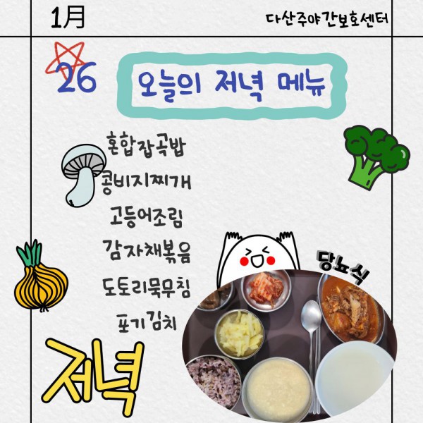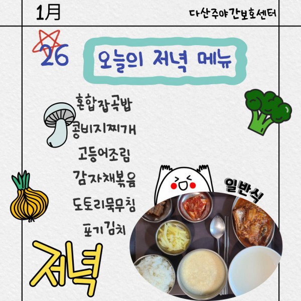 1월26일 저녁식단 페이지 정보 작성자 명품다산주야간보호센터 작성일26-01-26 16:07 조회992회 댓글0건 관련링크 이전글 다음글 목록 본문 저녁식단 입니다.(일반식,당뇨식,간반식) 이전글 다음글 목록