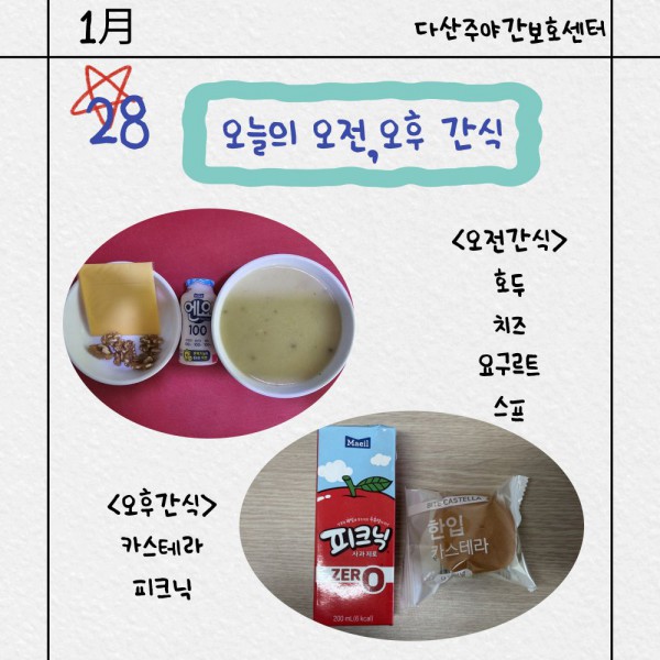 1월28일 오전/오후간식 페이지 정보 작성자 명품다산주야간보호센터 작성일26-01-28 15:13 조회966회 댓글0건 관련링크 이전글 다음글 목록 본문 오전/오후간식 입니다. 이전글 다음글 목록