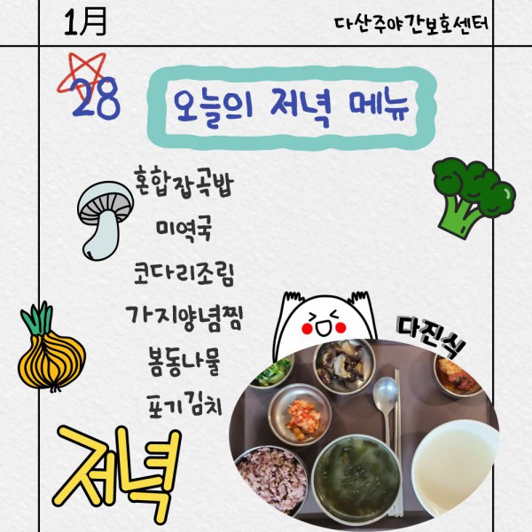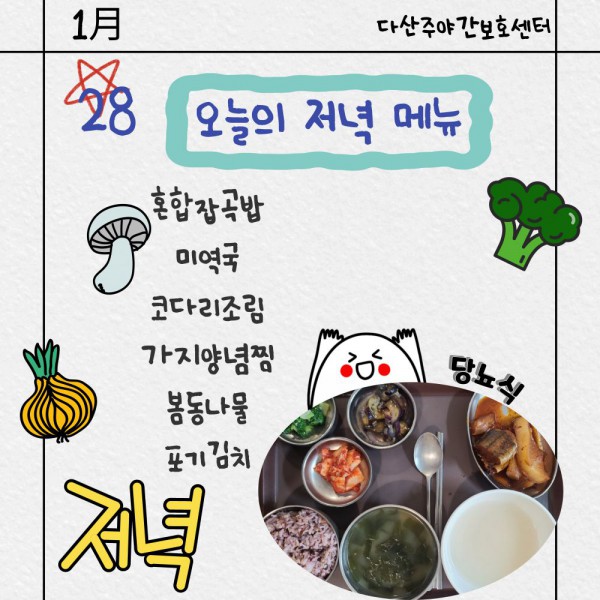 1월28일 저녁식단 페이지 정보 작성자 명품다산주야간보호센터 작성일26-01-28 16:12 조회966회 댓글0건 관련링크 이전글 다음글 목록 본문 저녁식단 입니다.(일반식,당뇨식,간반식) 이전글 다음글 목록