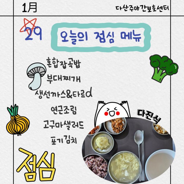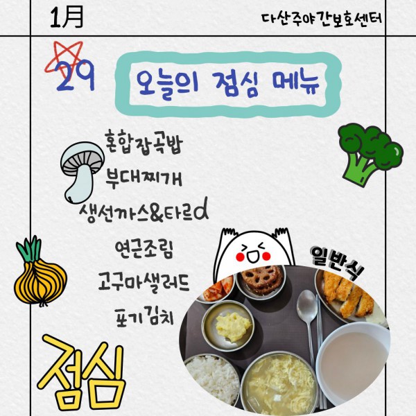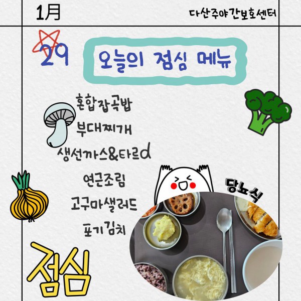1월29일 점심식단 페이지 정보 작성자 명품다산주야간보호센터 작성일26-01-29 20:40 조회964회 댓글0건 관련링크 이전글 다음글 목록 본문 점심식단 입니다.(일반식,당뇨식,간반식) 이전글 다음글 목록