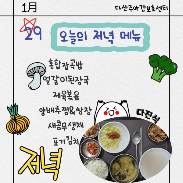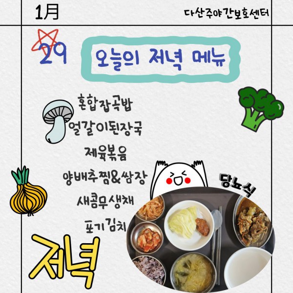1월29일 저녁식단 페이지 정보 작성자 명품다산주야간보호센터 작성일26-01-29 20:41 조회975회 댓글0건 관련링크 이전글 다음글 목록 본문 저녁식단 입니다.(일반식,당뇨식,간반식) 이전글 다음글 목록