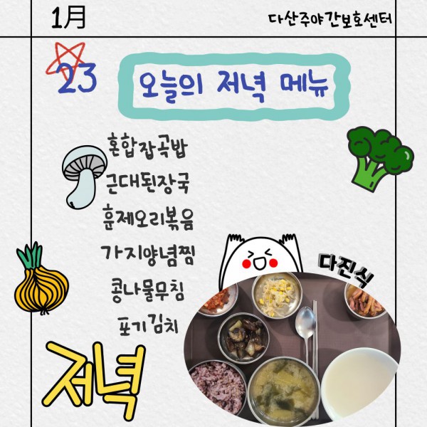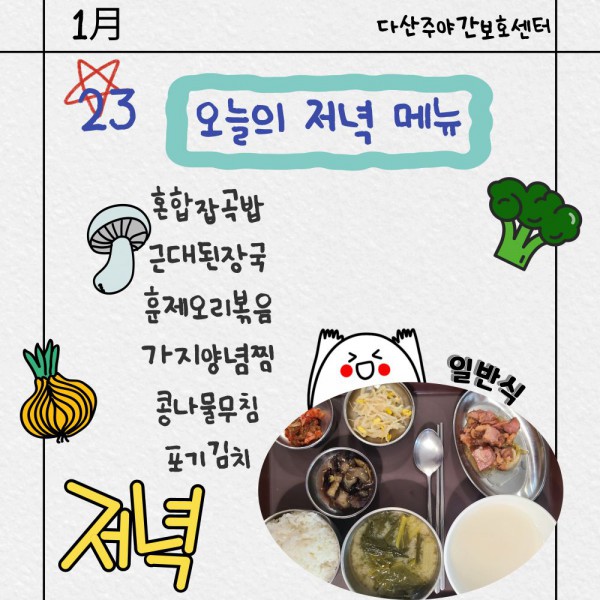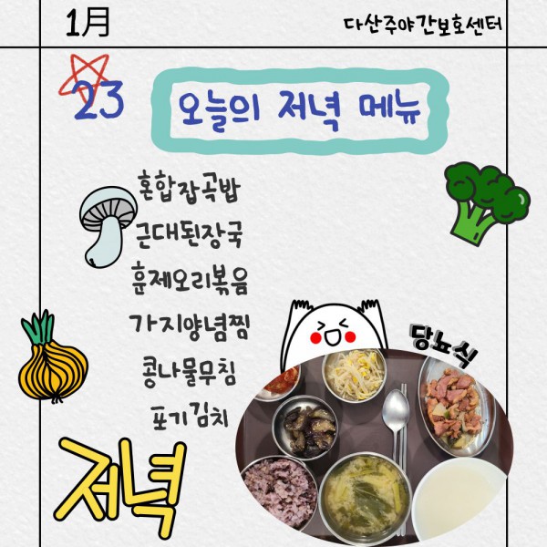 1월23일 저녁식단 페이지 정보 작성자 명품다산주야간보호센터 작성일26-01-23 16:05 조회984회 댓글0건 관련링크 이전글 다음글 목록 본문 저녁식단 입니다.(일반식,당뇨식,간반식) 이전글 다음글 목록